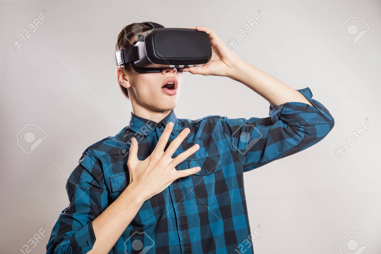 Emotional Funny Man Wearing Virtual goggles video game