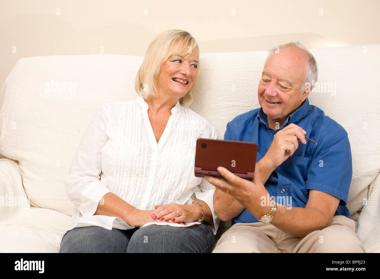 Two adults play on a Nintendo DS Lite nintendo ds two