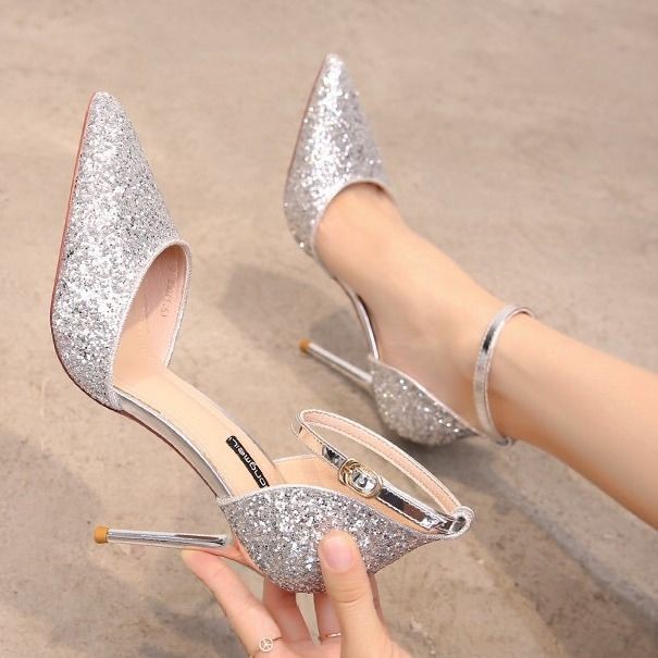 2020 Korean version of silver pointed silver fat heels