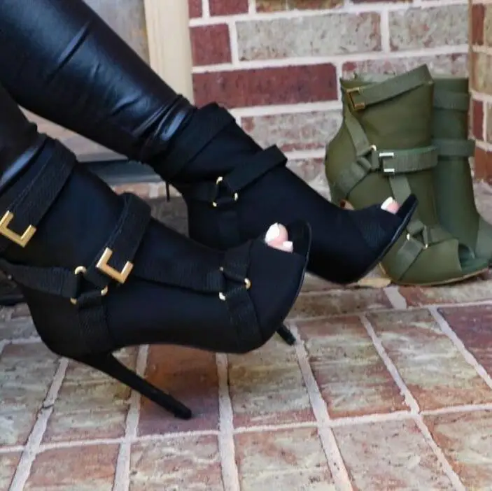 Army Green Peep-Toe Buckled Stiletto army green ankle boots peep toe