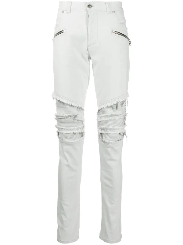 Shop white Balmain ribbed knees ripped white knee ripped jeans