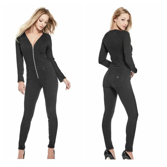 New Guess Womens Black Denim Longsleeve womens black denim jumpsuit