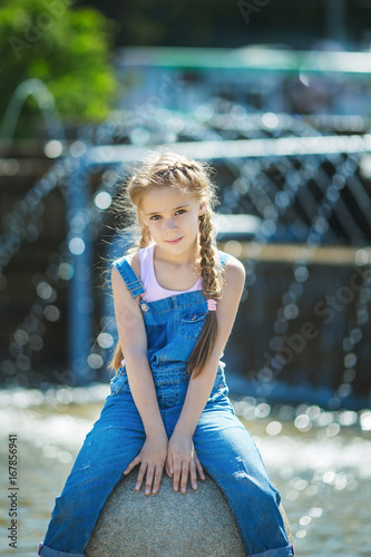 Summer portrait of a little girl of 6 little girl in overalls