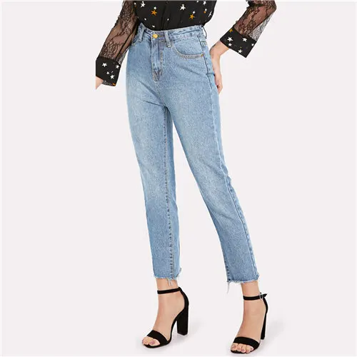 COLROVIE Blue Casual Solid Frayed Hem blue jeans with frayed hem
